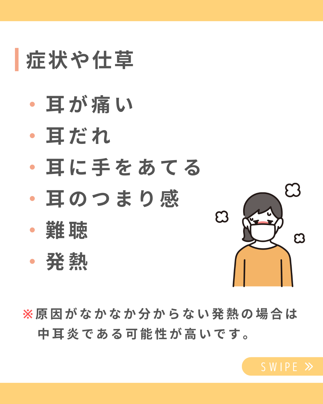 耳が痛い・耳だれ・耳に手をあてる・耳のつまり感・難聴・発熱