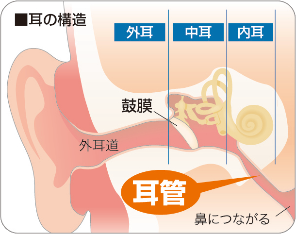 鼻の奥と鼓膜を結ぶ通り道で、鼓膜が常に良い状態を保てるように、気圧調整のための気圧弁の働きをしています。 通常、耳管は閉鎖していますが、あくびをしたり、物を飲み込んだりする時に開き気圧調整をしています。
